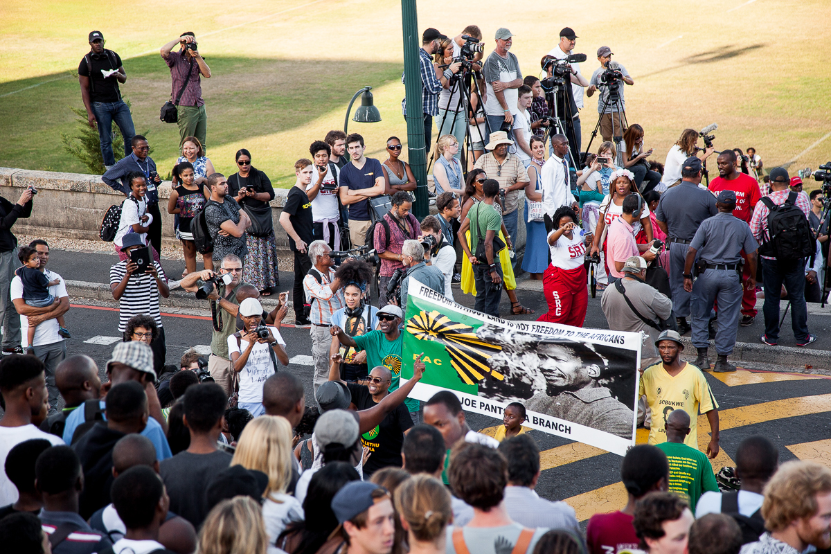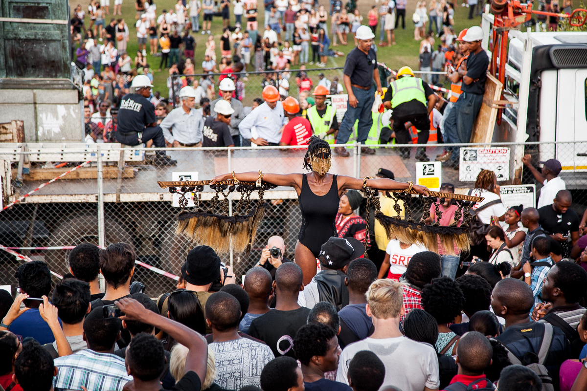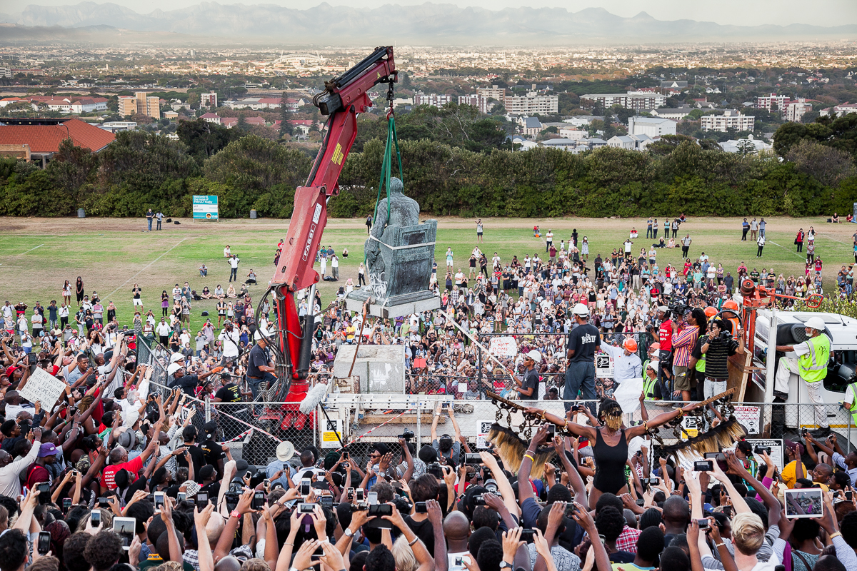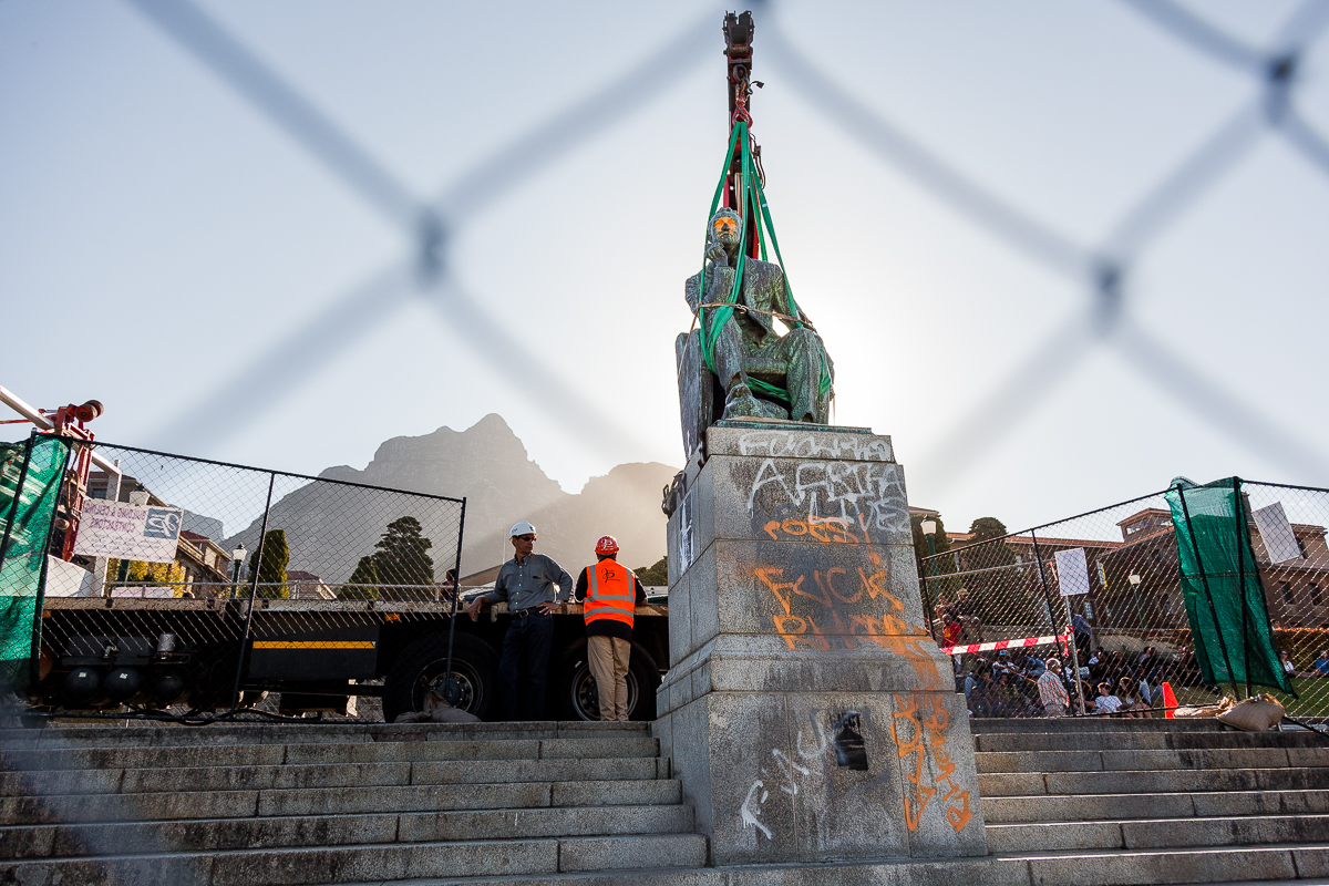 After a Month of Protests, University of Cape Town Removes Major Monument.Thursday’s events were set in motion a month ago when Chumani Maxwele, a 30-year-old political science student, flung feces at the Rhodes statue, which has occupied a prominent position in the middle of campus since being erected in 1934. “Seeing the statue every day pained me; it made me very angry,” Maxwele said. “Rhodes dispossessed and killed black people. His footprints are all over our country.”“This movement is not just concerned with the removal of a statue,” they wrote in a widely publicized mission statement. “Its removal will not mark the end but the beginning of the long overdue process of decolonizing this university.”On April 8, at the end of a meeting disrupted by students, UCT’s council ruled that the statue would be removed the following day.“As a black man, I never used to think about this statue, but now I do,” added his friend. Both students asked not to be named.“This is the biggest day in the history of this university,” said one third-year student as he jostled to watch the spectacle among thousands of other onlookers.Besides calling for the removal of offensive statues and plaques on campus, the movement insisted on increased financial support for black students, greater representation of black academic staff—UCT has just five black South African senior professors—and the adoption of pro-worker policies.