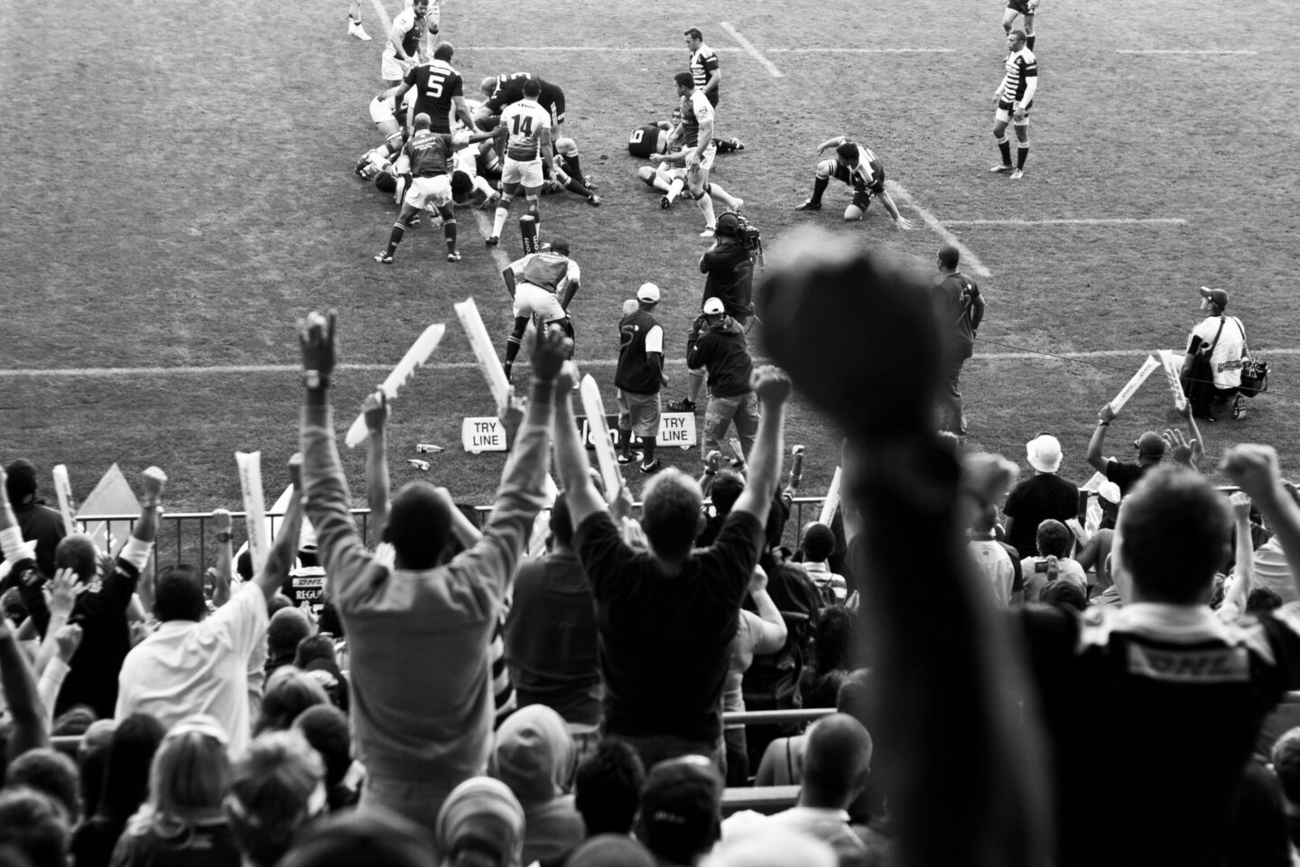I was in the crowd, not behind it. That choice is the photograph. The try line is in the background, the arms are in front, and somewhere in between is the reason I brought a camera instead of just watching.